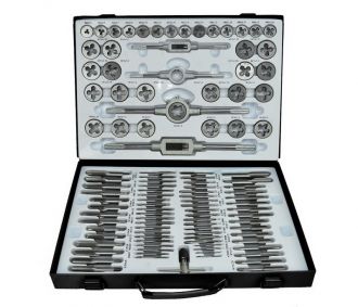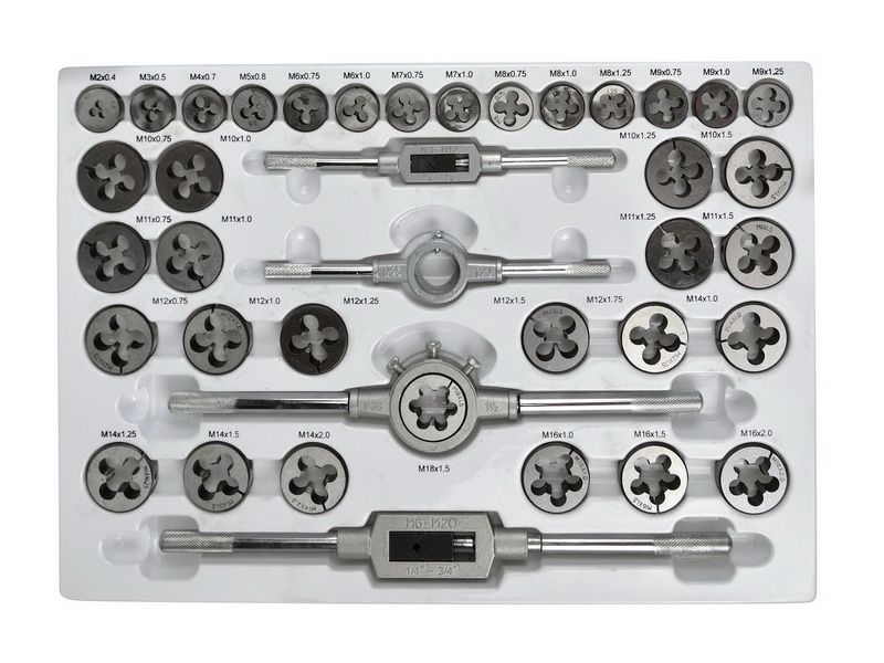 Инструменты изготовлены из прочной инструментальной стали, что обеспечивает высокую точность обработки и длительный срок службы. Комплект включает метчики, плашки, держатели и вспомогательные инструменты, необходимые для нарезания резьбы различных размеров.