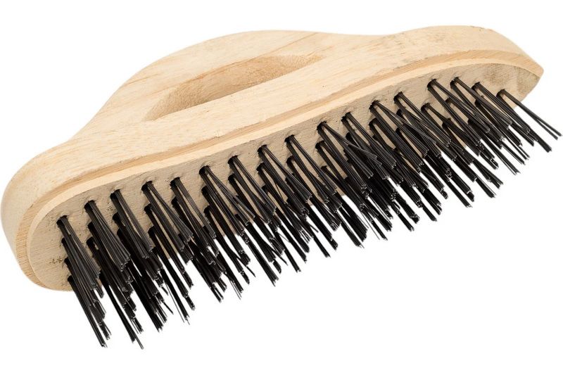 Деревянный корпус с П-образной профилированной ручкой обеспечивает надежный хват и лучший контроль усилия, что особенно удобно при продолжительных работах. Конструкция снижает риск соскальзывания инструмента и повышает комфорт использования. Щетка подходит для полупрофессионального применения в мастерских, гаражах и на стройплощадках.
